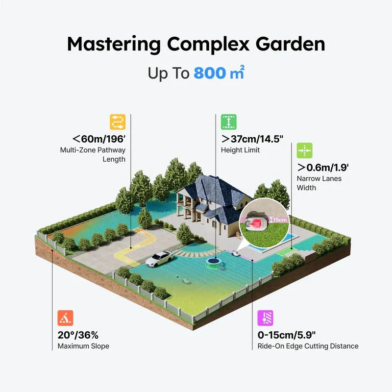 Idéal pour les jardins aux configurations complexes. TerraMow planifie des trajectoires optimales tout en évitant les obstacles en 3D en temps réel. Il offre une tonte de haute précision. même dans les zones avec massifs de fleurs. bordures irrégulières. buissons ou arbres. Ultra agile. il se faufile dans des passages étroits de seulement 60 cm de large.